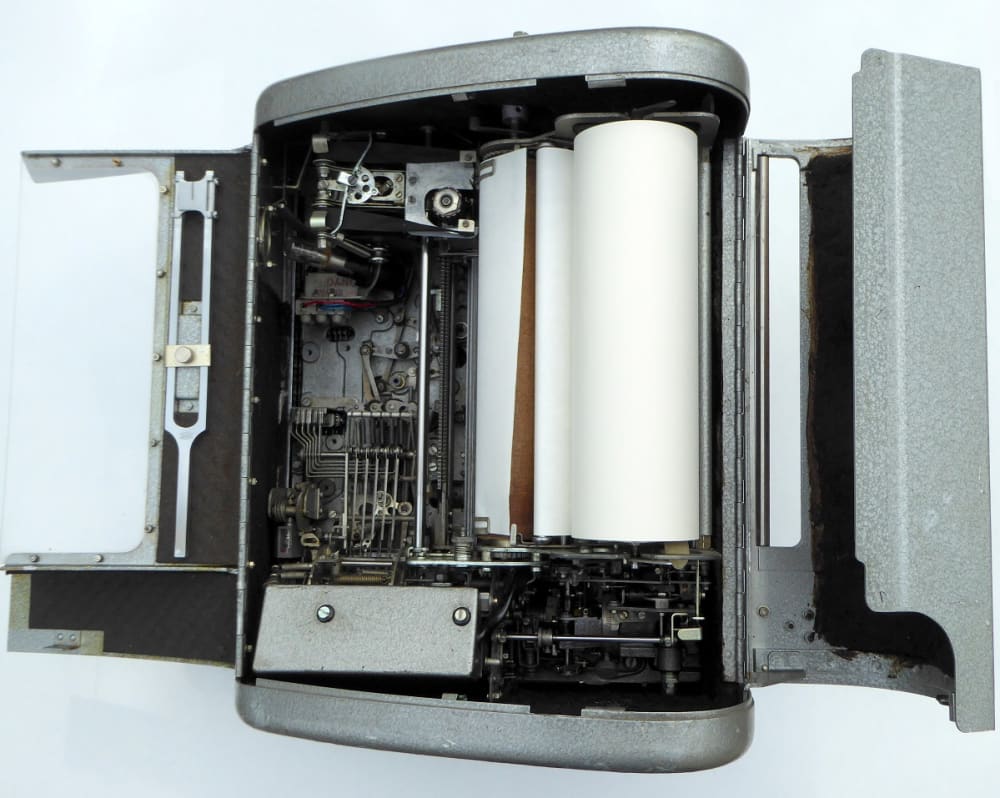 (Blick von oben in das aufgeklappte Gerät, Typenzylinder links, walze hinten)